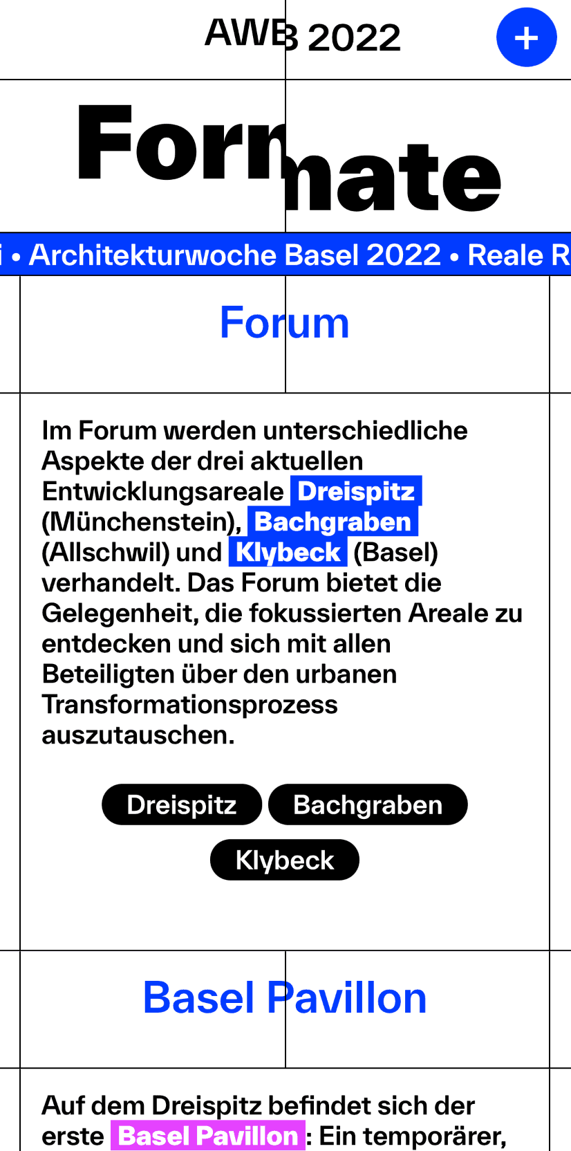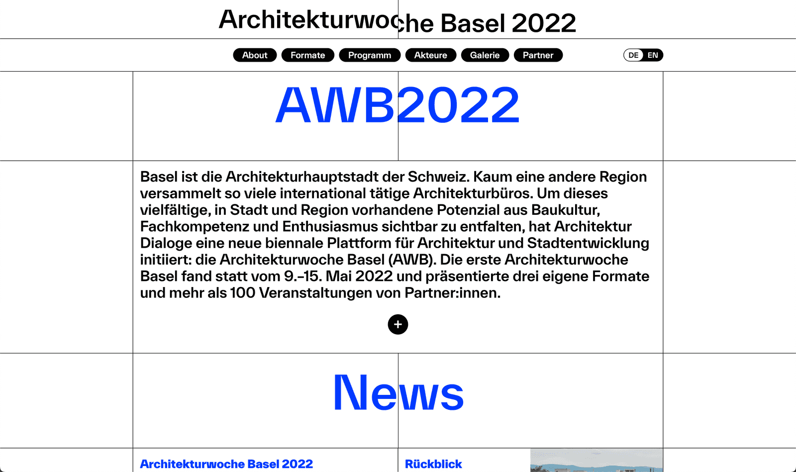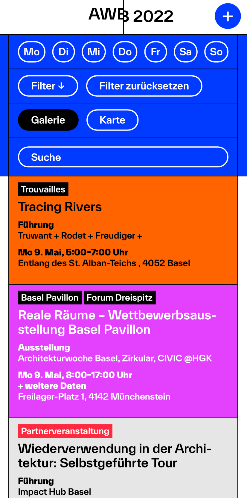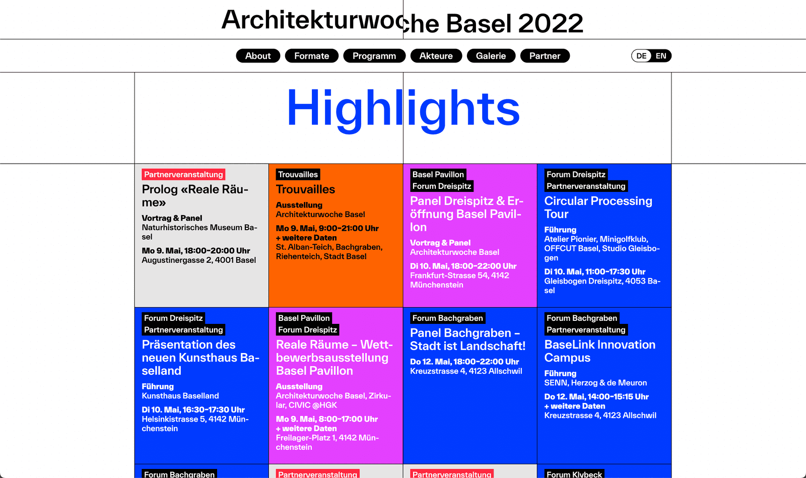 Basel ist die Architekturhauptstadt der Schweiz. Kaum eine andere Region versammelt so viele international tätige Architekturbüros. Um dieses vielfältige, in Stadt und Region vorhandene Potenzial aus Baukultur, Fachkompetenz und Enthusiasmus sichtbar zu entfalten, hat Architektur Dialoge eine neue biennale Plattform für Architektur und Stadtentwicklung initiiert: die Architekturwoche Basel (AWB). Die erste Architekturwoche Basel fand statt vom 9.–15. Mai 2022 und präsentierte drei eigene Formate und mehr als 100 Veranstaltungen von Partner:innen.